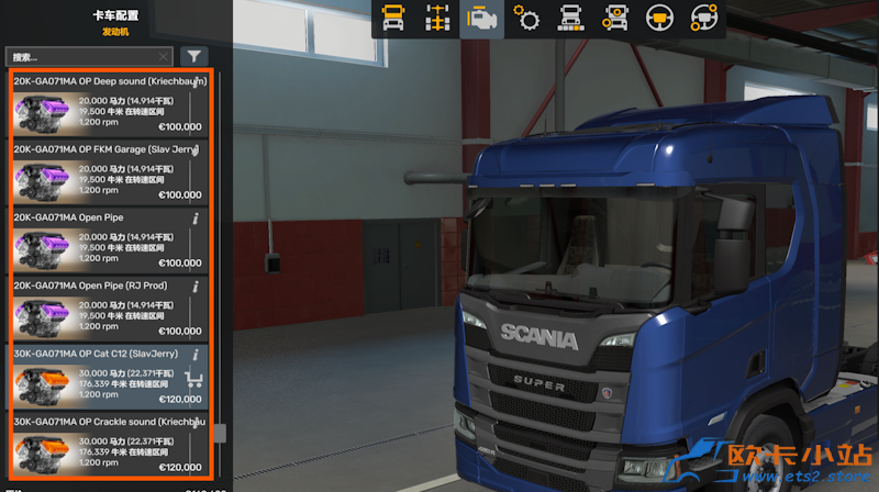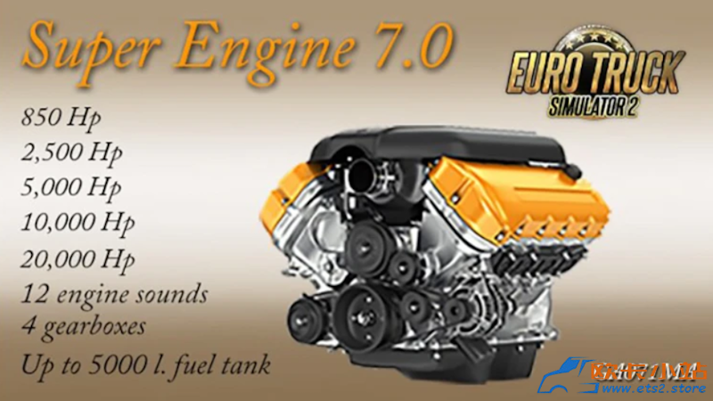 模组简介:模组为SCS大约有50辆标准卡车增加了6款强劲的发动机(850/2.5k/5k/10k/20k/30k马力)、4款有趣的变速箱、12种酷炫的发动机音效,以及高达5000升的油箱容量等等