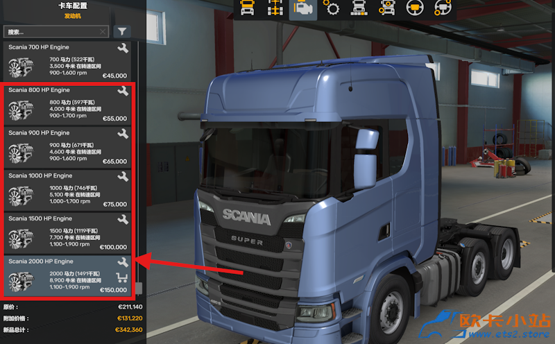 模组简介:模组可提供2种变速箱和700马力、800马力、900马力、1000马力、1500马力和2000马力6款发动机,适用于所有SCS原装卡车和部分改装卡车的发动机和变速箱。支持的卡车: