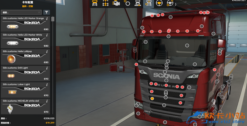 模组简介:适用于新一代斯堪尼亚的超级灯光改装包,包括车顶灯杆,位置灯, 辅助灯,带米其林轮胎人偶灯